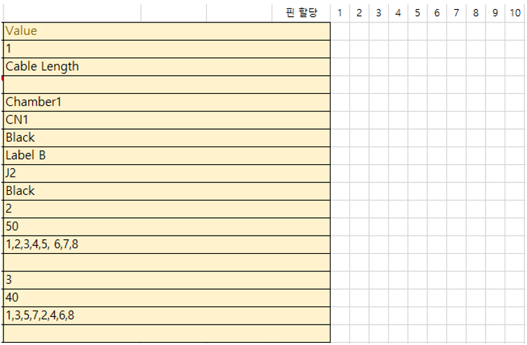 | Pin Assignment | 케이블 와이어 번호. 커넥터 핀 수만큼 정의하며, 할당은 핀 번호 순서대로 콤마로 구분하여 기술한다. |