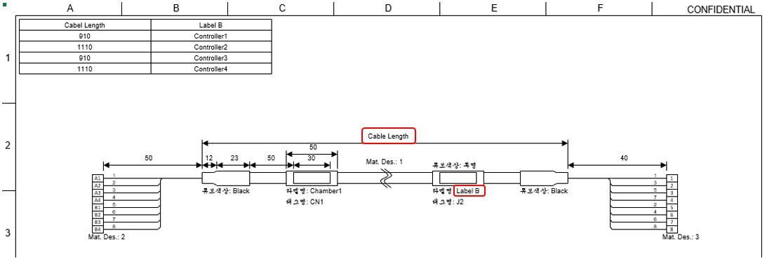 동일 Harness에 라벨(또는 길이)만 다르게 적용하고 싶은 경우, 도면에 라벨 테이블을 추가할 수 있다. 이 기능은 ‘테이블 시트 이름’ 항목에 테이블 정보가 있는 엑셀 시트 이름을 입력해주고, 해당 엑셀 시트에서 테이블을 만들어 주면 된다.