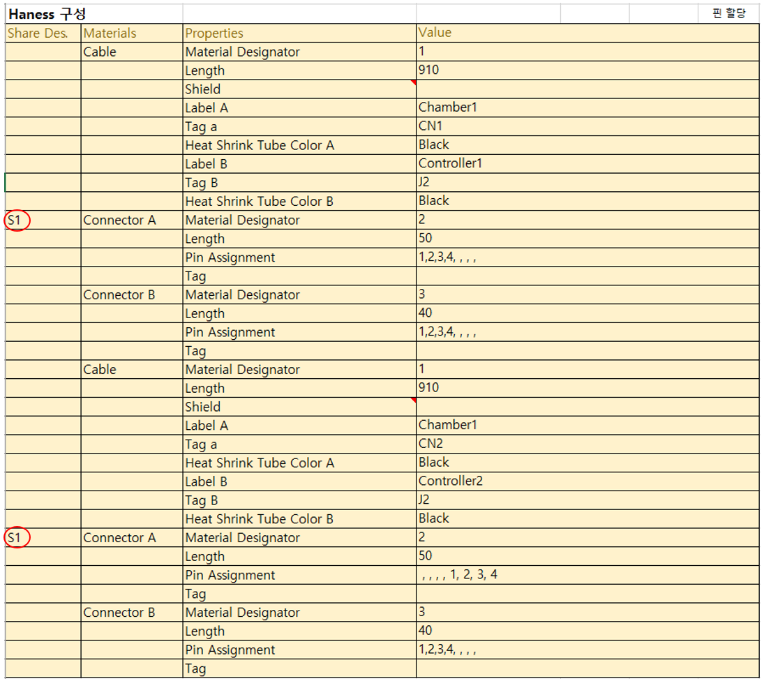 위 도면처럼 하나의 커넥터가 2개의 케이블에서 공유되는 경우, 아래처럼 Share Des. 열에서 공유되는 커넥터에 동일한 지정자를 임의로 지정해 주면 된다.