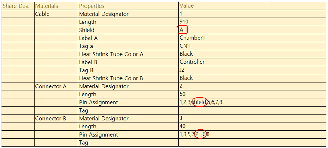 Shield는 커넥터 하우징과 Bonding 되거나 커넥터의 한 핀에 Drain Wire가 연결되는 형태를 취한다. 커넥터 하우징에 Bonding하기 원할 경우, Connector A(B) 자재 정의 부분에서 따로 정의할 것은 없다. 그러나, Drain Wire를 커넥터 핀에 할당하고자 할 경우, 해당 핀 번호 자리에 “shield”를 입력한다.
