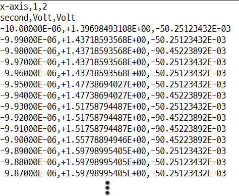 위 예제 CSV 파일은 3개의 열로 구성된다. 오실로스코프에서 저장되는 CSV 파일은 첫 열이 시간 데이터이다. 그리고 두번째 열부터 순서대로 신호 데이터열이 된다. 여기서는 2개의 신호 데이터 열이 있는 것을 볼 수 있다.