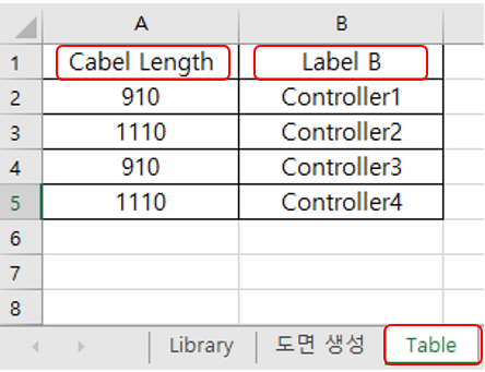 테이블 엑셀 시트의 A1 셀부터 도면에 표시될 표를 작성한다. 이때 헤더 부분의 각 항목은 “도면 생성” 시트의 Label A(B), Tag (A/B), 또는 길이와 이름을 같게 해주는 것이 바람직하다.