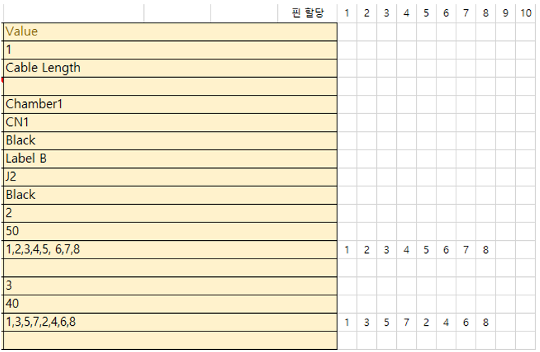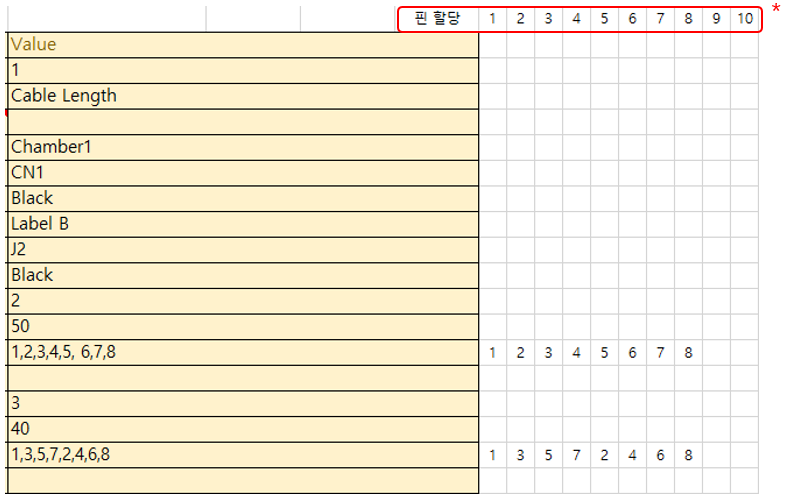 | Pin Assignment | 케이블 와이어 번호. 커넥터 핀 수만큼 정의하며, 할당은 핀 번호 순서대로 콤마로 구분하여 기술한다. |