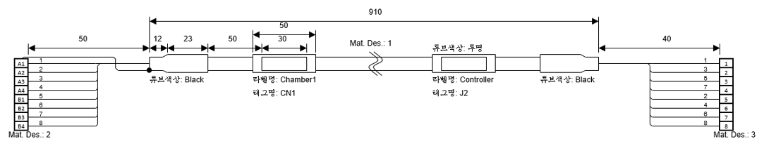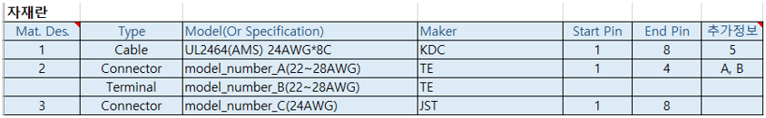 | 추가 정보 | Type이 Cable인 경우, 수축튜브 직경 값 Type이 Connector인 경우, 핀 번호 prefix(옵션). Prefix는 콤마로 구분하여 다중 사용 |