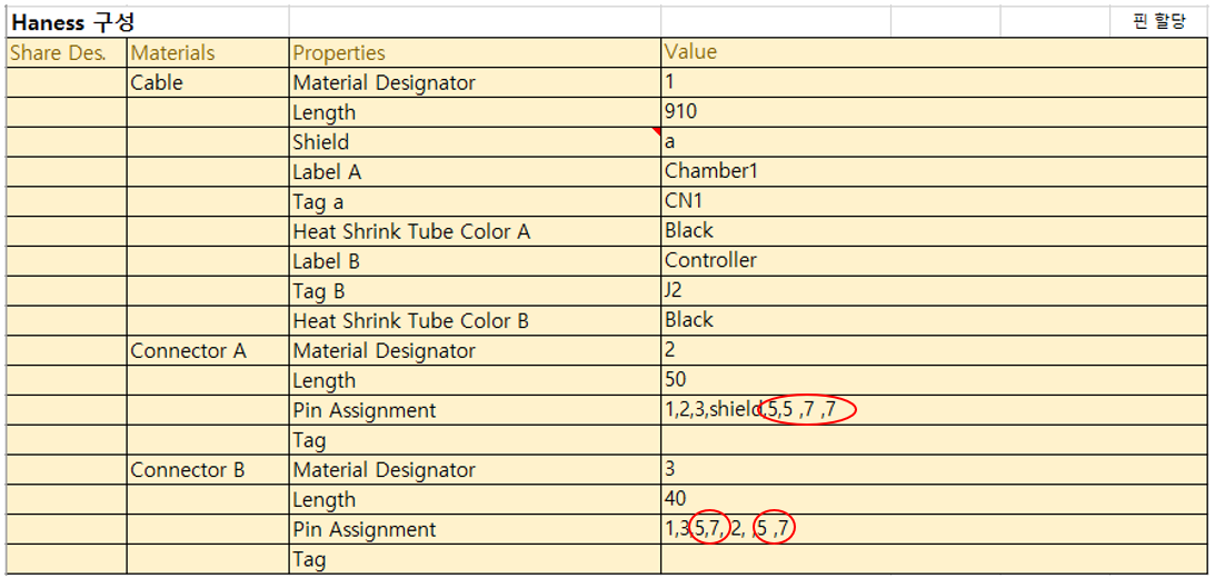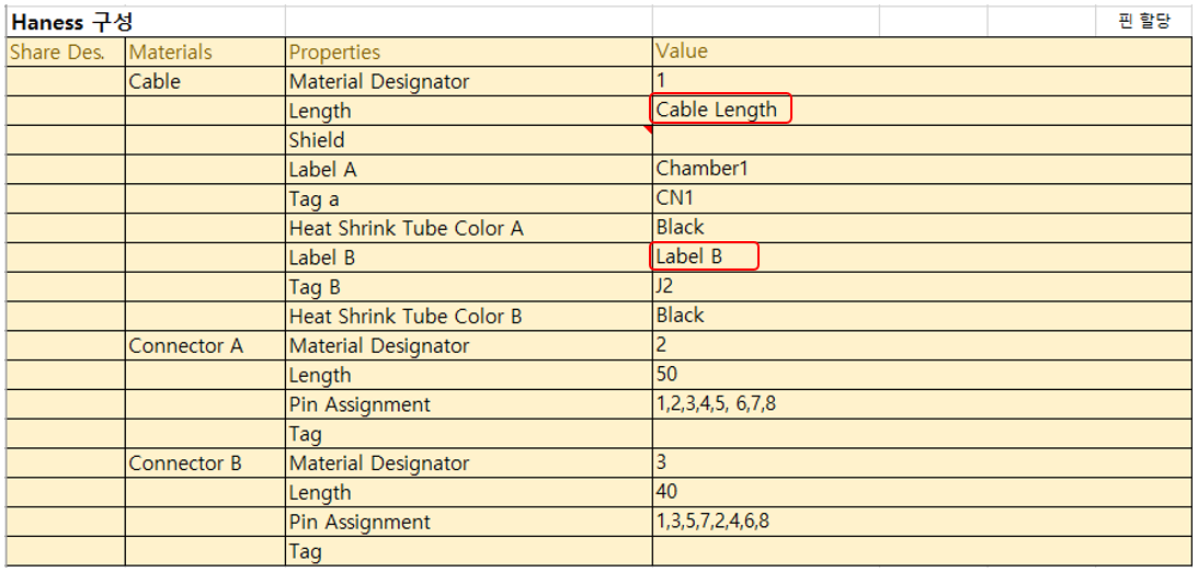 위 도면처럼 하나의 커넥터가 2개의 케이블에서 공유되는 경우, 아래처럼 Share Des. 열에서 공유되는 커넥터에 동일한 지정자를 임의로 지정해 주면 된다.