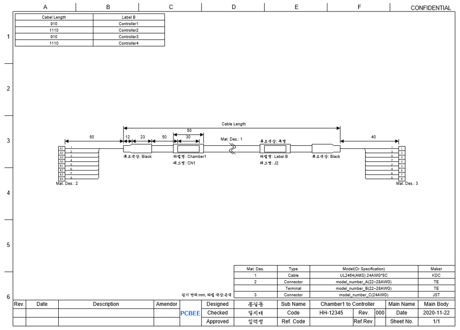 이 Harness는 하나의 Cable이 있으며 케이블 왼쪽(A쪽)에 1개의 커넥터가 있고, 오른쪽(B쪽)에 1개의 커넥터가 있다. 이 Harness에서 사용되는 자제는 3장 자재란에서 정의된 자재이다. 이 구성 정의는 다음과 같다.