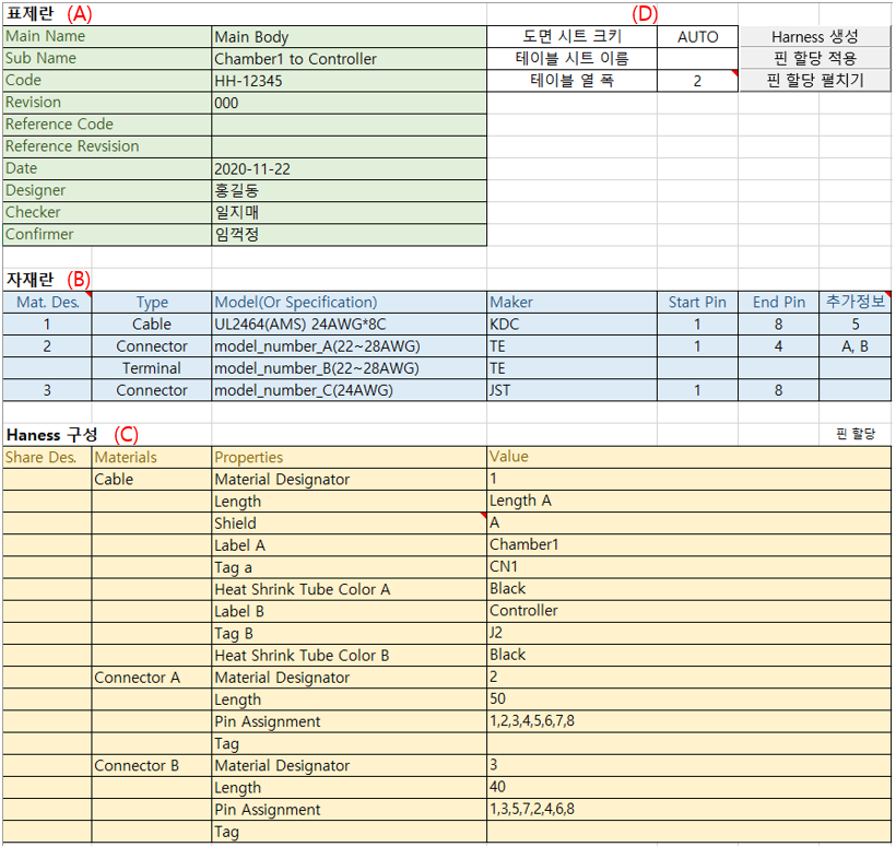 Harness Wizard 입력 시트 구성은 표제란(A), 자재란(B), Harness 구성(C), 그리고 기타(D) 네 부분으로 되어 있다.