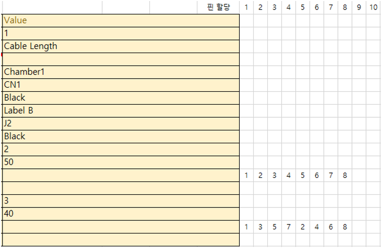 | Tag | Cable 자재에서 태그를 사용하지 않을 경우, 커넥터 쪽에서 태그를 정의할 수 있다. 태그는 하나만 정의해서 커넥터 전체를 대표하거나, 콤마로 구분해서 핀 수만큼 정의한다. |