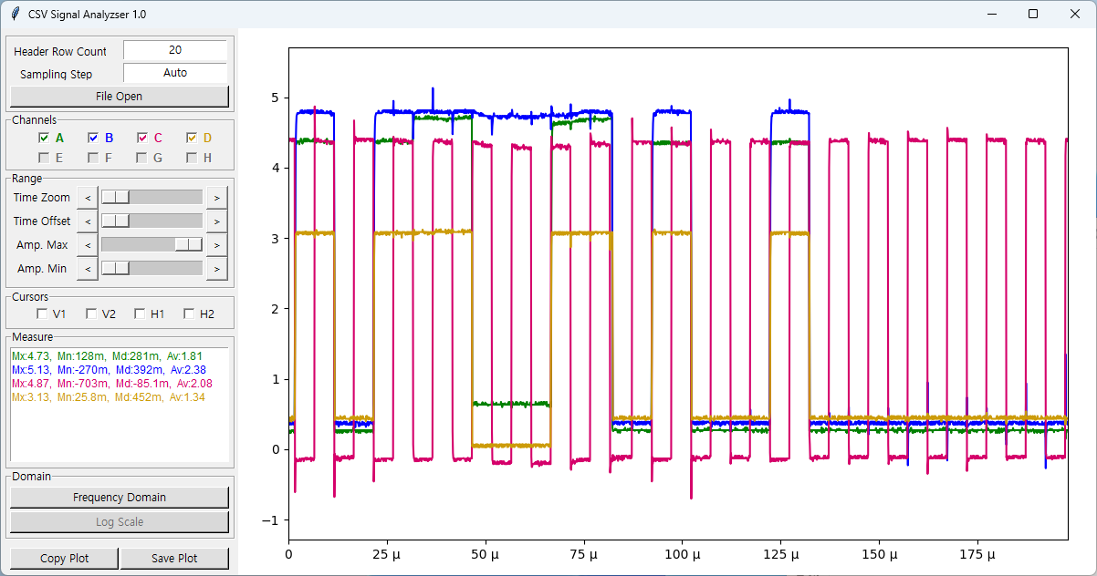 도구/기타 2024. 6. 9. 21:45오실로 스코프로 신호를 측정할 떄, 종종 측정 결과를 CSV 포맷으로 저장하는 경우가 있다. 이는 나중에 PC에서 후가공을 하거나 측정 결과 보고서를 작성할 때 첨부로 쓰기 위함일 것이다. 그런데, CSV로 저장된 파일은 PC에서 보기가 쉽지 않다. 스코프 제조사에서 제공해주는 도구를 사용하거나 엑셀을 사용해야 한다. 제조사 도구 같은 경우 제공되지 않거나 찾기 어려운 경우가 있고, 엑셀 같은 경우 CSV 파일이 크면 행수 제한으로 데이터까 짤리는 문제와 속도가 현저하게 느려지는 문제 등이 있다. 이에 쉽게 CSV 파일을 열어서 파형을 보고 쉽게 보고서에 Copy&Paste를 할 수 있는 도구를 만들어 보았다.